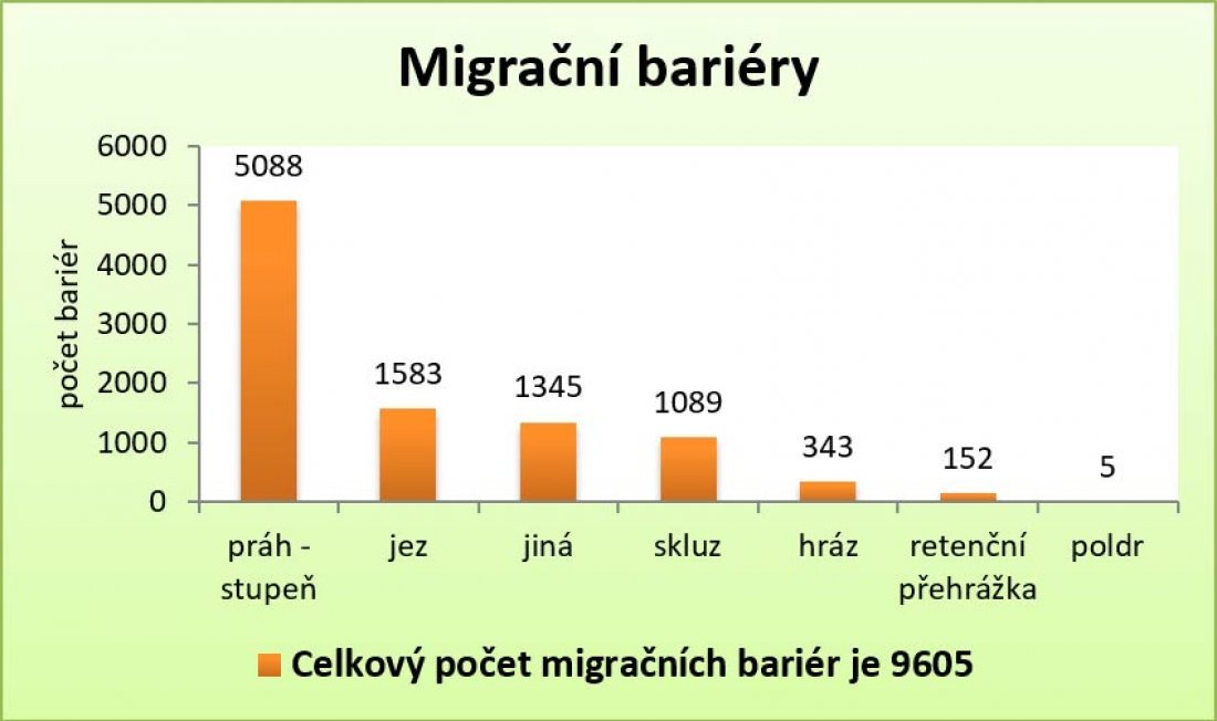 Pasportizace příčných objektů byla provedena v období září r. 2016 – ledna r. 2017 na tocích mezinárodního významu dle Koncepce zprůchodnění říční sítě ČR (MŽP, 2014) a v chráněných územích ČR (EVL, NPR, NPR a první zóny CHKO), případně ostatních tocích významných z hlediska ichtyofauny. Celkem bylo zmapováno 9 605 migračních bariér (viz Mapa č.1) na tocích o celkové délce 11 458 km. Graf č.1 znázorňuje počet zjištěných migračních bariér určitého typu.