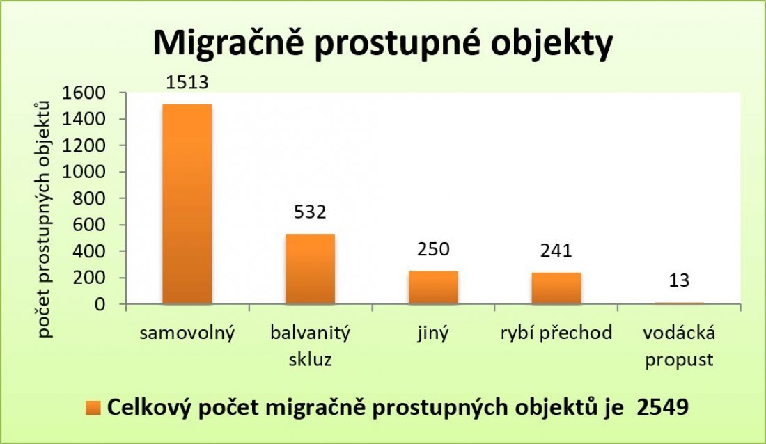 Z celkového počtu migračních překážek bylo průchozích 2 504. Migrační průchodnost zajišťovaly migračně prostupné objekty různého typu, jako jsou např. rybí přechody, balvanité skluzy, vodácké propusti aj., anebo byla překážka natolik poškozená, že byla samovolně průchozí. Celkem bylo zmapováno 2 549 těchto objektů, z nichž bylo 241 rybích přechodů (viz Mapa č.2). V grafu č.2 je znázorněn počet zjištěných jednotlivých typů migračně prostupných objektů.