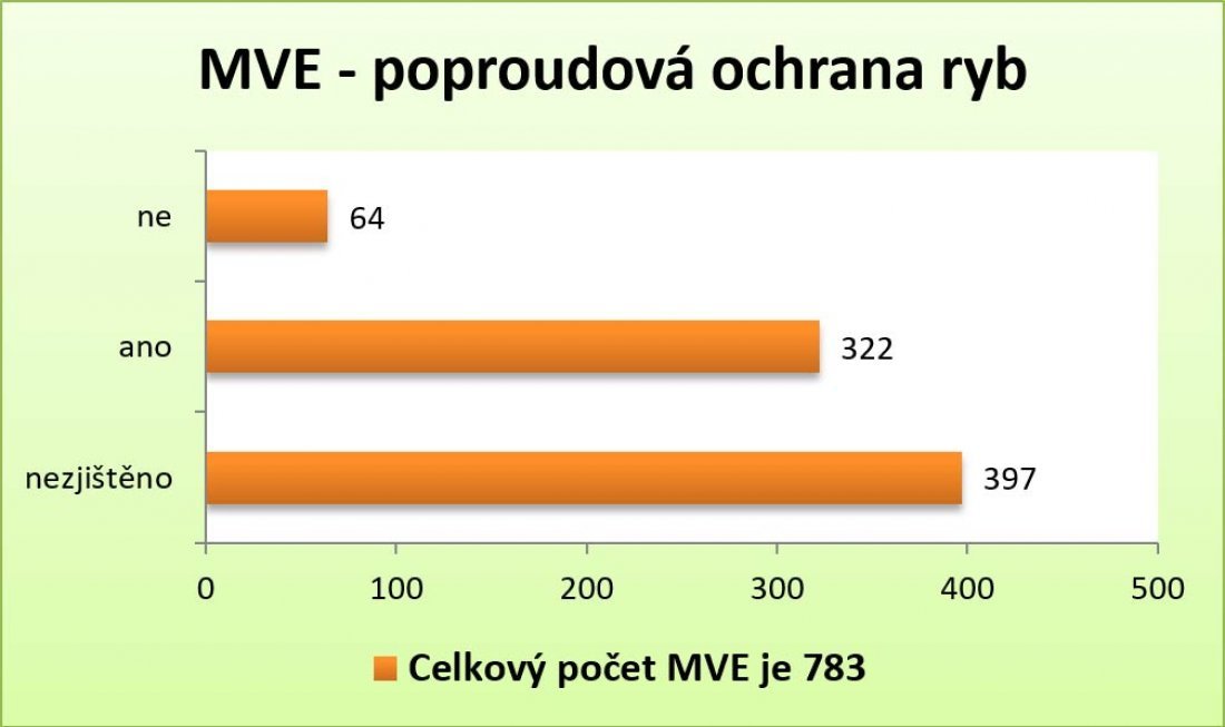 Dále byly sledovány malé vodní elektrárny (dále jen MVE), které mají významný vliv především na poproudovou migraci ryb. Kromě samotných staveb bylo mapování zaměřeno na zjištění opatření zajišťující navigaci či poproudovou ochranu ryb. Jedná se např. o mechanické zábrany, jako jsou jemné česle umístěné před vtokem do MVE nebo elektronické odpuzovače (více informací o dané problematice naleznete v kategorii „Migrační bariéry a MVE“). Z celkového počtu, tj. 783, zmapovaných MVE (viz Mapa č.3), bylo zjištěno alespoň jedno ochranné opatření u 322 z nich. V ostatních případech nebyly instalovány odpuzovače či zábrany žádné nebo nebyly zjištěny (viz Graf č.3).