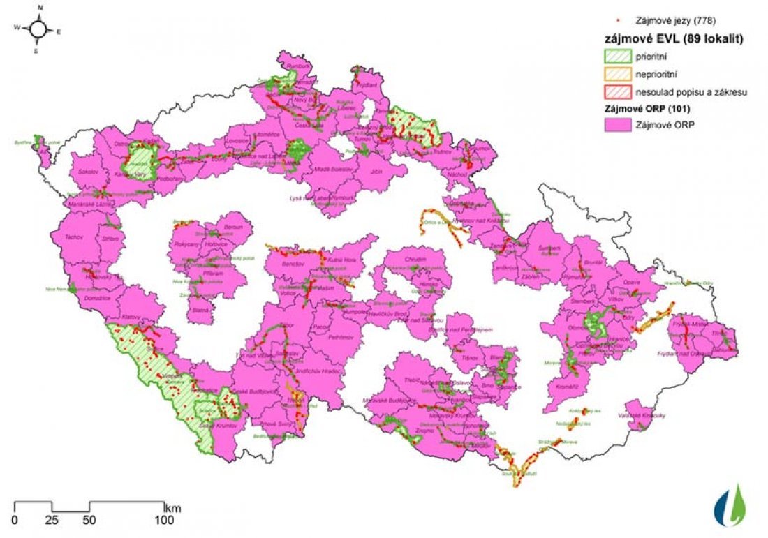 Mapa č. 5 Přehled vybraných EVL a příslušných ORP, kde bylo sledováno nakládání s vodami